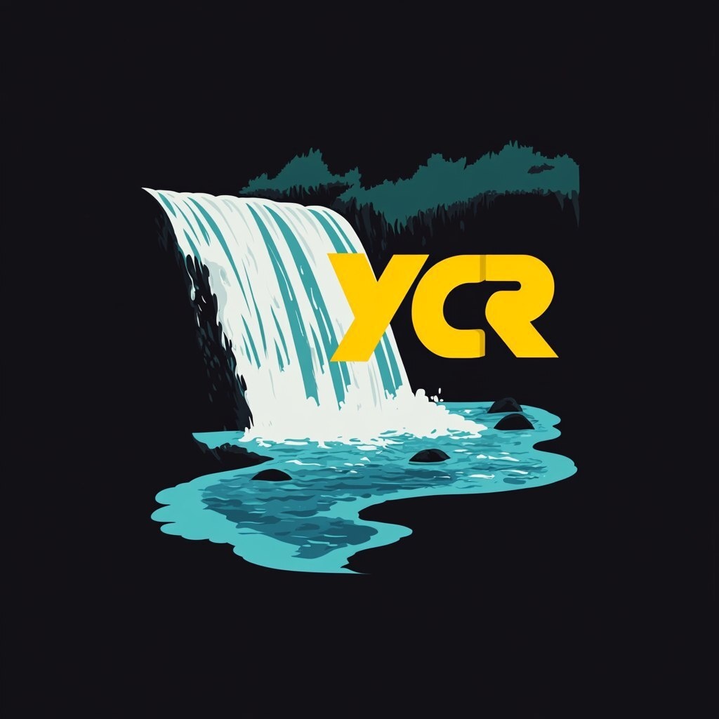 Создано на основе запроса: Minimalist vector-style animated logo of a waterfall flowing smoothly, with a bold yellow ‘YCR’ integrated into
