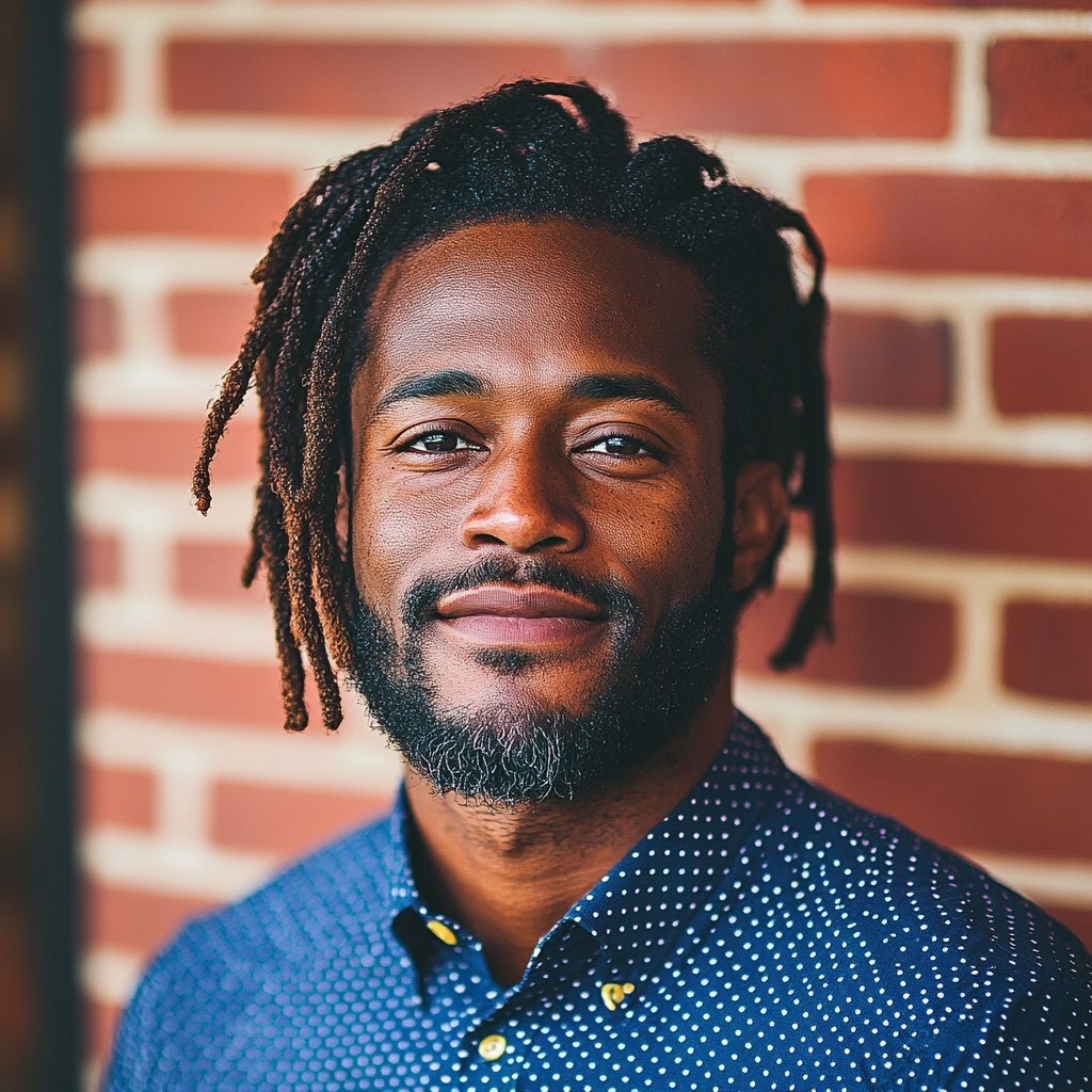 Создано на основе запроса: A professional headshot of an African American man in his late thirties, wearing a blue polka dot shirt with dark brown hair and short dreadlocks pulled back on the side of his face, smiling at the camera. He is standing against a red brick wall. Use soft lighting to highlight his facial features. The background should be blurred but clear enough that it does not distract attention from what he has to say about artificial intelligence. High-resolution photography using a Canon EOS R5 mirrorless camera.