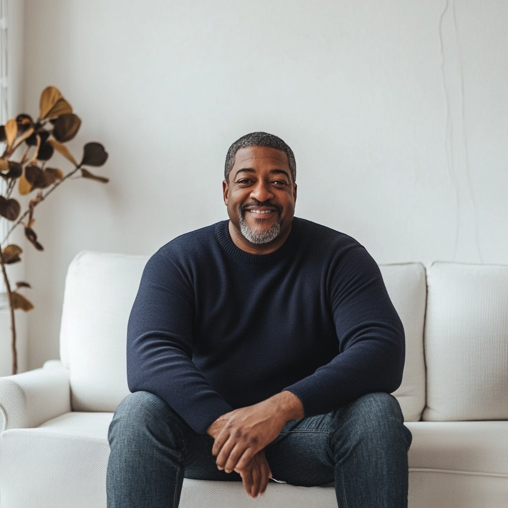 Создано на основе запроса: a man sitting on a white sofa, leaning forward as if actively listening