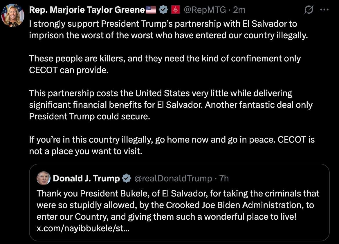 ‘These people are killers, and they need the kind of confinement only CECOT can provide’: MTG backs Trump administration’s deportation of illegals to El Salvador #MTG