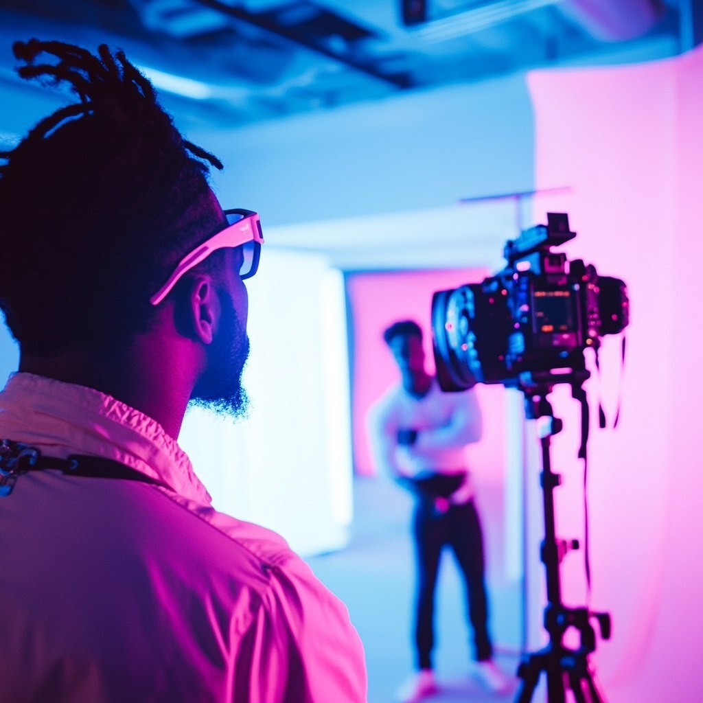 Создано на основе запроса: on a music video set. the scene is white minimalist studio in the dark with a hipster director looking thru the lens of a video camera recoding a male hip hop dancer in background. the lighting is mainly royal blue and magenta neon. subte cinematic lighting HD ar --- Автоперевод: На музыкальном видео. Как тебе вариант? 🤔 https://dzen.ru/id/65c0c65c86e4f837c27b24d7 #ИИ #AI #нейросеть #midjourney #art