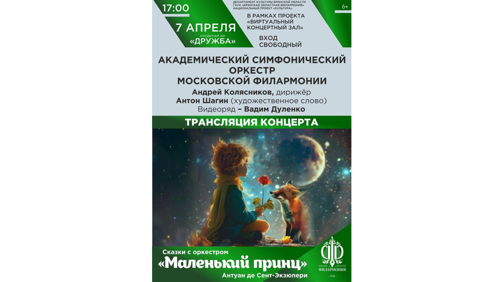 Жителей Брянска приглашают на трансляцию концерта «Сказки с оркестром: «Маленький принц». Она состоится 7 апреля в 17:00 в концертном зале «Дружба». В программе участвует академический симфонический оркестр Московской филармонии дирижёра Андрея Колясникова. Видеоряд подготовил Вадим Дуленко, художественное слово – брянский актёр Антон Шагин. Музыкальную сказку по произведению Антуана де Сент-Экзюпери покажут в рамках трансляций концертов Московской Государственной академической филармонии по проекту «Виртуальный концертный зал». Об этом рассказали в Брянской областной филармонии. Вход свободный. 6+ Брянская филармония покажет «Маленького принца»