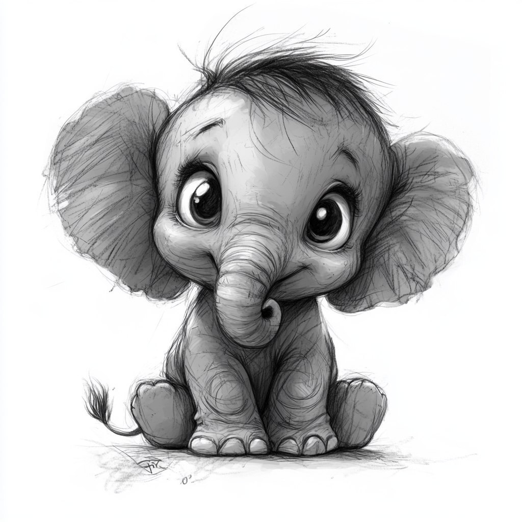 Создано на основе запроса: A cute baby elephant with large, expressive eyes and fluffy ears, drawn in a realistic black and white sketch