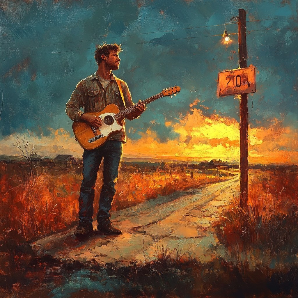 Создано на основе запроса: Man standing at a crossroads with a guitar at the side of him with country setting and cool lighting