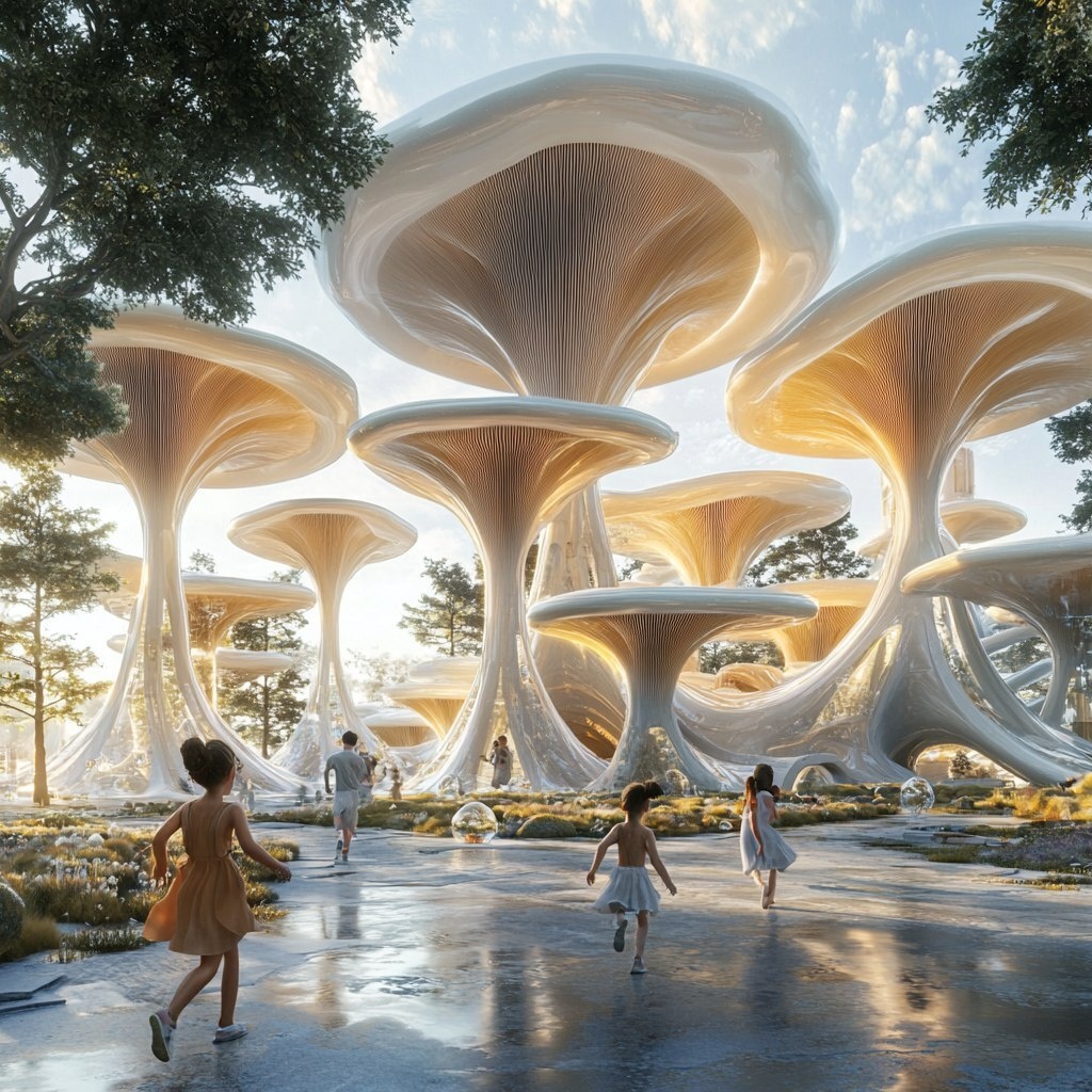 Создано на основе запроса: a group of kids running around on a futuristic resort inspired by architectural biomimicry made of mushroom
