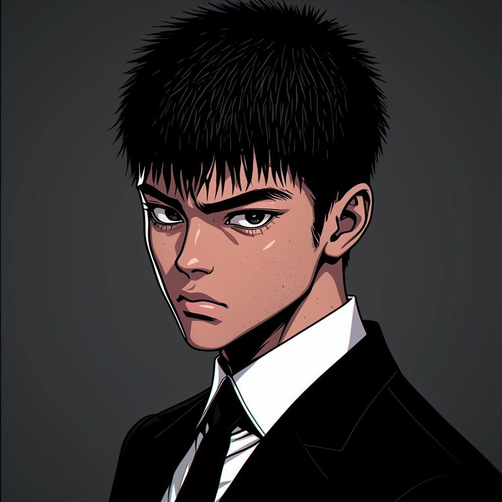 Создано на основе запроса: Three-quarter upper body portrait of a confident young man in anime style, facing slightly left, head turned toward the viewer, eyes forward, slight smirk, clean cel-shading, sharp jawline, short hair with shaved side patterns, wearing a black suit with white dress shirt, relaxed pose, soft shadows on face, flat gray background, ultra-detailed ink lines, professional character design, 8K Katsuhiro Otomo - Akira style