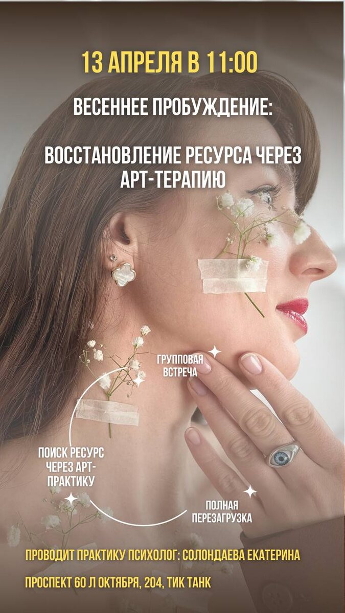 ДОРОГИЕ ДЕВУШКИ🌸 Весна - время пробуждаться от зимней спячки, восстанавливать свою жизненную энергию и идти покорять этот МИР! Я приглашаю вас на арт-практику «Весеннее пробуждение», где в приятной поддерживающей атмосфере, вы найдете свой внутренний ресурс, напитаетесь мягкой женской энергетикой, выстроите план для дальнейших действий. Встреча состоится: Г.Хабаровск 🗓️13 апреля ⏰11:00 📍проспект 60-л Октября, 204, Тик танк 💰1500 рублей Время практики: 2- 2,5 часа Запись в личные сообщения по 100% предоплате @ESolondaeva