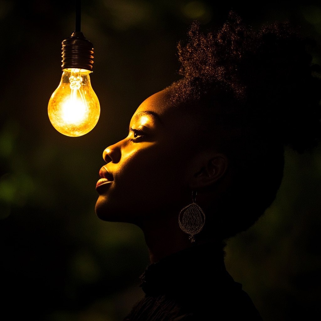 Создано на основе запроса: a world renowoned photograph high defintion low lit photo of a nigerian woman back lit by an artsy light bulb