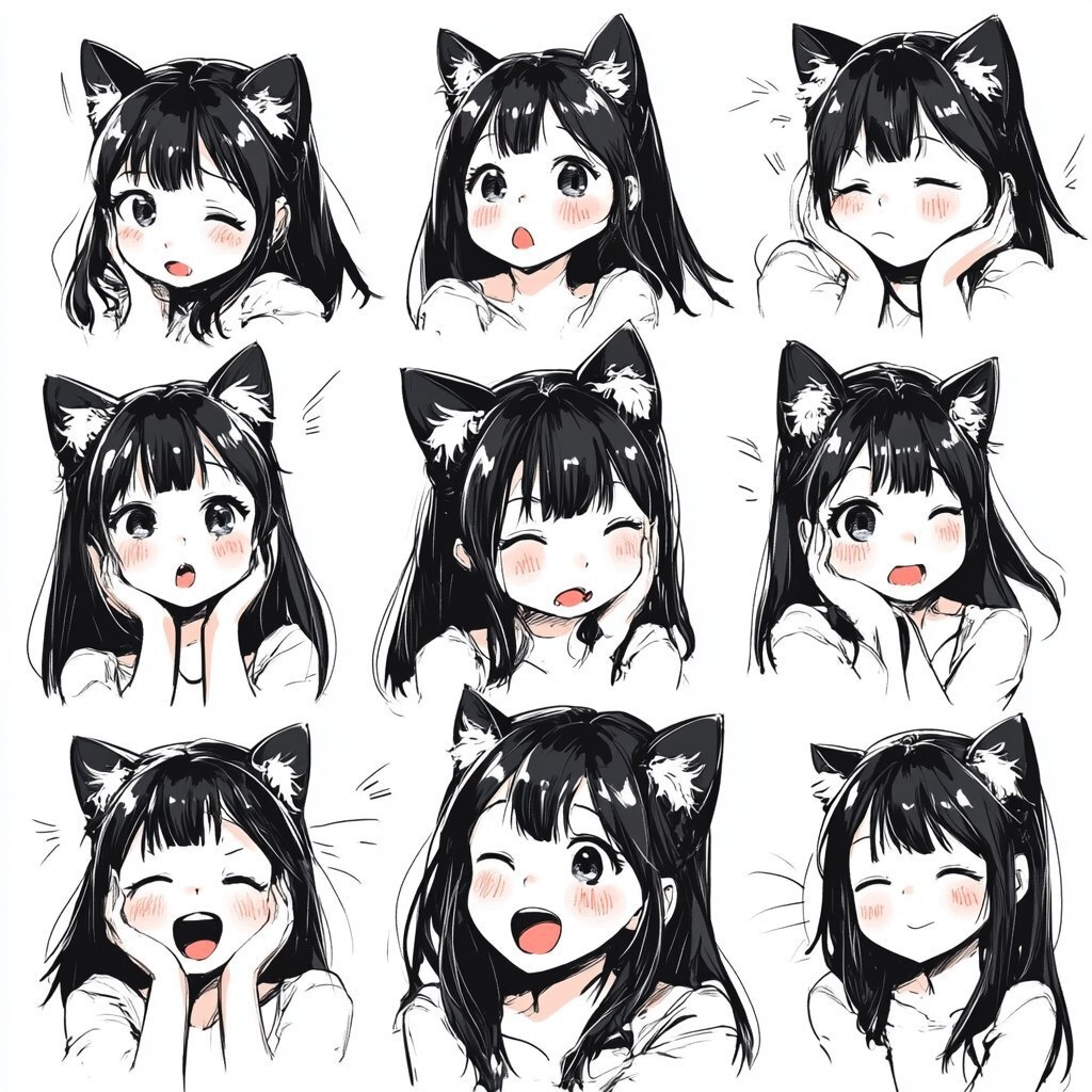 Создано на основе запроса: line stamps,9division ,cute teenage girl with black cat ears Anime style ,various poses and expression