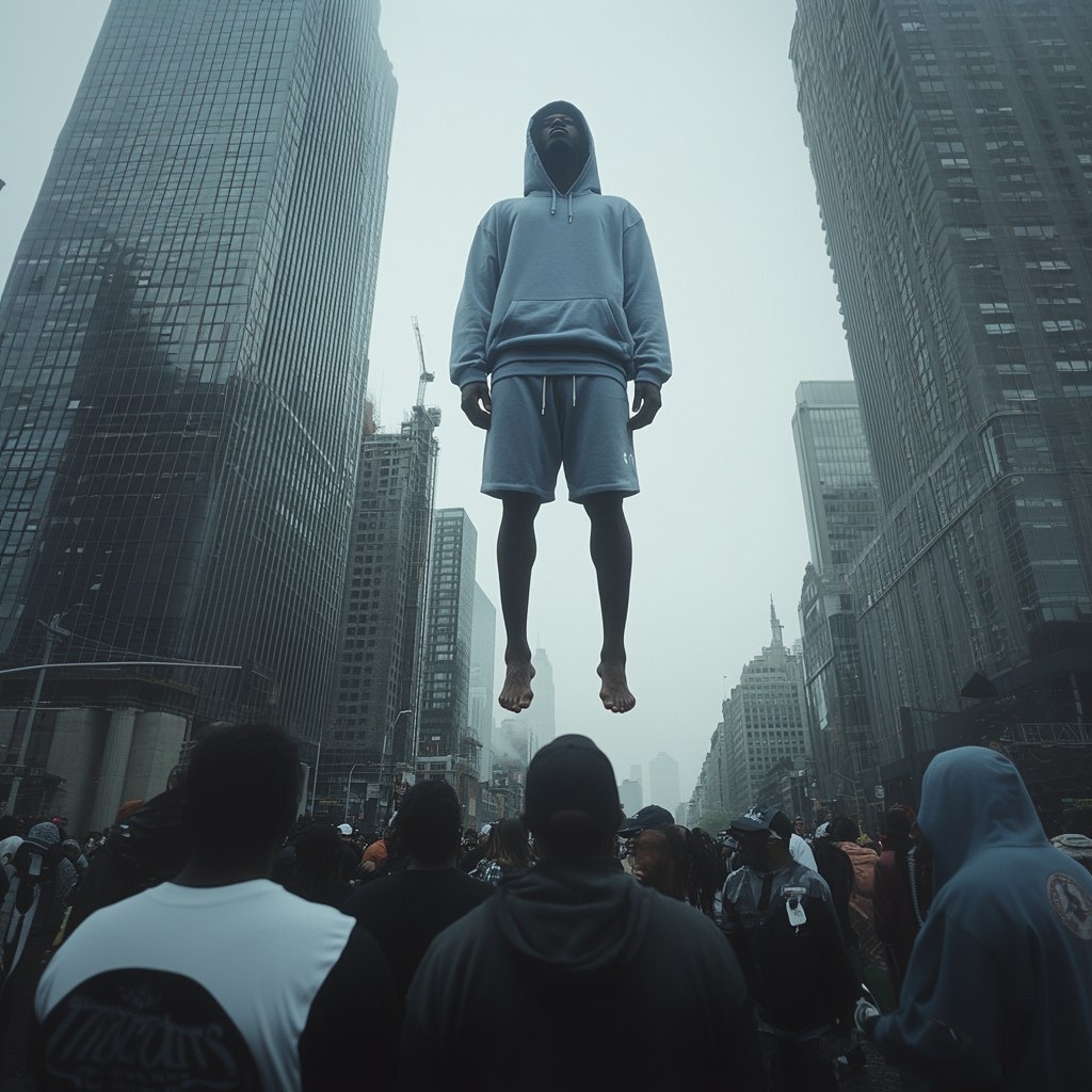 Создано на основе запроса: A Black man wearing a blue hooded streetwear stands in the middle of an urban city, surrounded by people on all