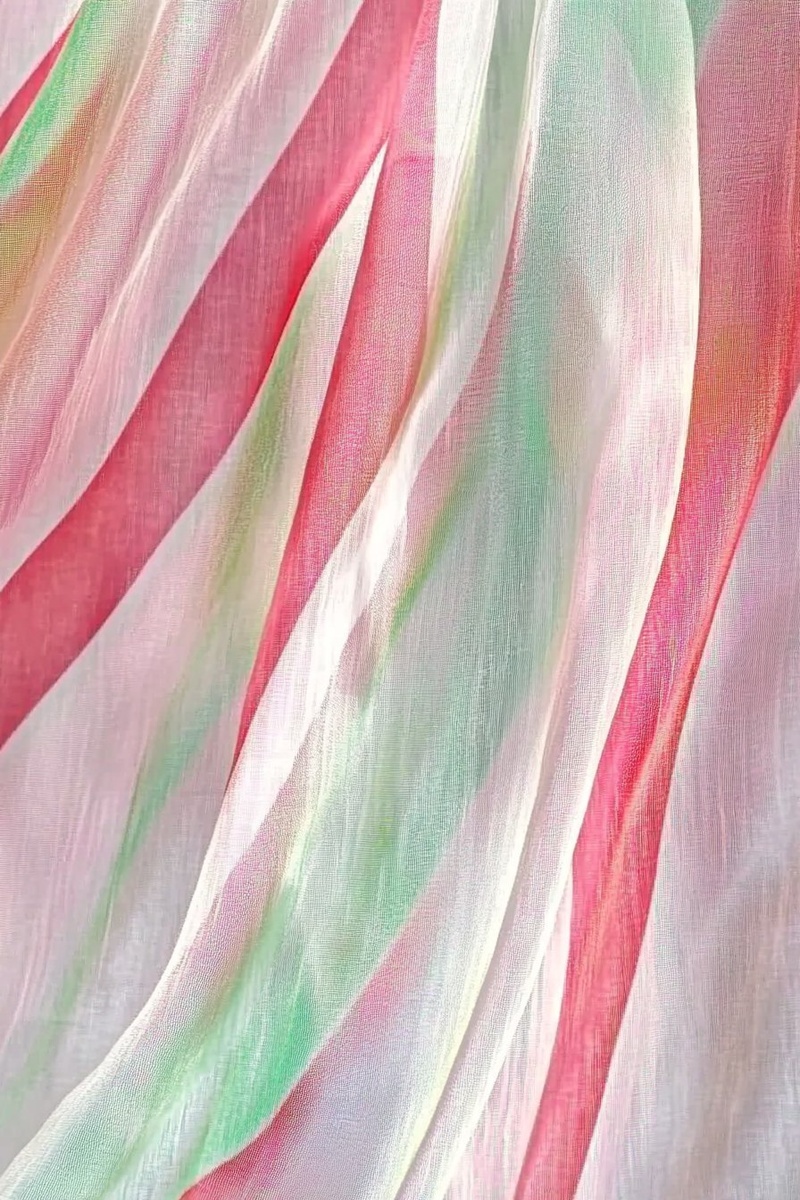 Создано на основе запроса: A close-up of the texture and pattern on a sheer curtain, with soft pastel colors like pink, green, red, and