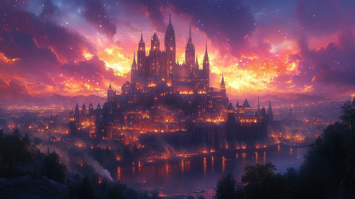 Создано на основе запроса: Medieval Las Vegas, a grand cityscape illuminated by glowing torches and magical lanterns, towering Gothic castles with intricate stone carvings. Cobblestone streets filled with knights, merchants, and performers. A majestic fantasy skyline with neon-like enchanted lights, blending medieval charm with a mystical glow. The sky is painted with vibrant, luminous hues --- Автоперевод: Средневековый Лас -Вегас, грандиозный городской пейзаж, освещенный светящимися факелами и магическими фонарями, возвышающимися готическими замками со сложными каменными резьбами. Необычно выглядит? 🤔 https://dzen.ru/id/65c0c65c86e4f837c27b24d7 #ИИ #AI #нейросеть #midjourney #art