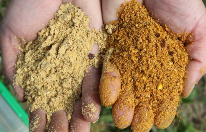 - Меласса - чёрная патока, побочный продукт производства сахара. Содержит до 60% сахарозы, а также минералы, которые стимулируют пищеварение рыбы. Меласса сильнее склеивает смесь, поэтому её добавляют не более 5% от объёма.