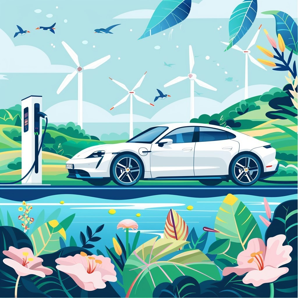 Создано на основе запроса: A Porsche car is being charged at a charging station. The background features wind turbines and flowers in the water, with blue birds flying around. Colorful vector illustrations. In front of them is a lake surrounded by lush vegetation. Flat illustration style, simple design, high resolution, professional vector art, no gradient lines, clear illustration details, professional quality, ultra clear picture quality. --- Автоперевод: Автомобиль Porsche заряжается на зарядной станции. Какое твое мнение? 🤔 https://dzen.ru/id/65c0c65c86e4f837c27b24d7 #ИИ #AI #нейросеть #midjourney #art