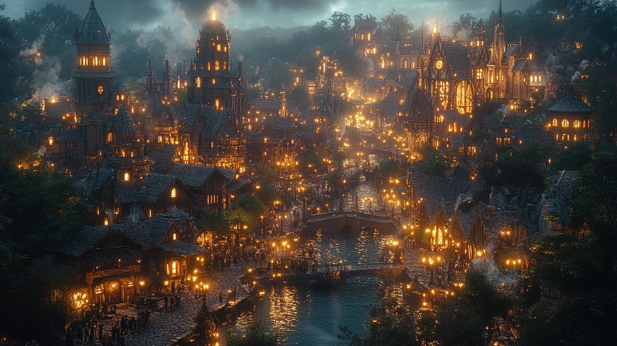 Создано на основе запроса: Medieval Las Vegas, a grand cityscape illuminated by glowing torches and magical lanterns, towering Gothic castles with intricate stone carvings, cobblestone streets filled with knights, merchants, and performers. A majestic fantasy skyline with neon-like enchanted lights, blending medieval charm with a mystical glow, breathtaking and cinematic atmosphere --- Автоперевод: Средневековый Лас -Вегас, грандиозный городской пейзаж, освещенный светящимися факелами и магическими фонарями, возвышающимися готическими замками с замысловатыми каменными резьбами, булыжными улицами, наполненными рыцарями, торговцами и исполнителями. Красиво вышло? 🤔 https://dzen.ru/id/65c0c65c86e4f837c27b24d7 #ИИ #AI #нейросеть #midjourney #art