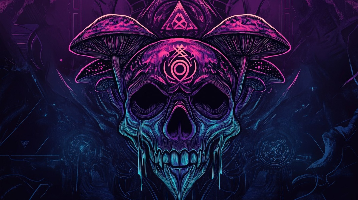 Создано на основе запроса: A dark and esoteric cult logo for 'Sèt Bouk' (The Seven Spirit Rings), a cyber-occult underground sect. The emblem features 'Tèt Chanje' – a skull with mushrooms growing from it, symbolizing transformation beyond death. The design is intricate and arcane, incorporating eerie veve-like glyphs, biopunk aesthetics, and a fusion of cybernetic and organic elements. Dark, ritualistic, and cryptic, with a mystic neon glow. The color scheme is a mix of deep blacks, glowing purples, and bioluminescent blues. The background suggests an urban dystopia, with hidden veve markings and cultist graffiti. High detail, cinematic lighting, and dark occult cyberpunk style. --- Автоперевод: Темный и эзотерический культ логотип для «Sèt Bouk» (The Seven Spirit Rings), кибер-белого подземной секты. Неплохо получилось? 🤔 https://dzen.ru/id/65c0c65c86e4f837c27b24d7 #ИИ #AI #нейросеть #midjourney #art