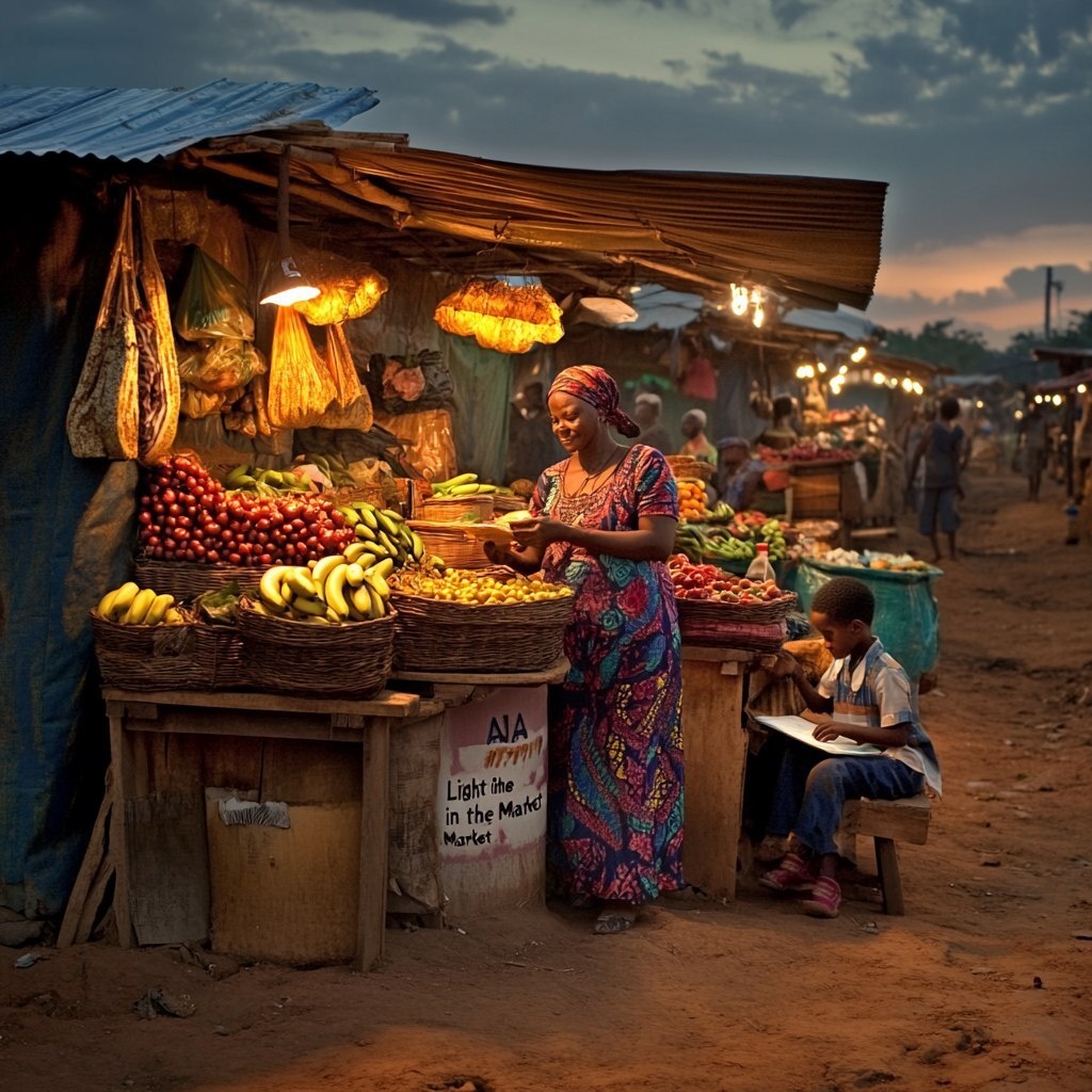 Создано на основе запроса: High-Quality Photo Concept: "A Light in the Market" Scene Composition: A bustling Nigerian marketplace, usually forced to shut down at sunset, now glows under solar-powered lights. Stalls made of wood and corrugated metal line the dirt road, displaying fresh produce, colorful textiles, and handmade goods. The solar lights cast a golden warmth over the market, illuminating vendors and customers engaged in evening trade. Beyond the market’s glow, the rest of the street fades into darkness