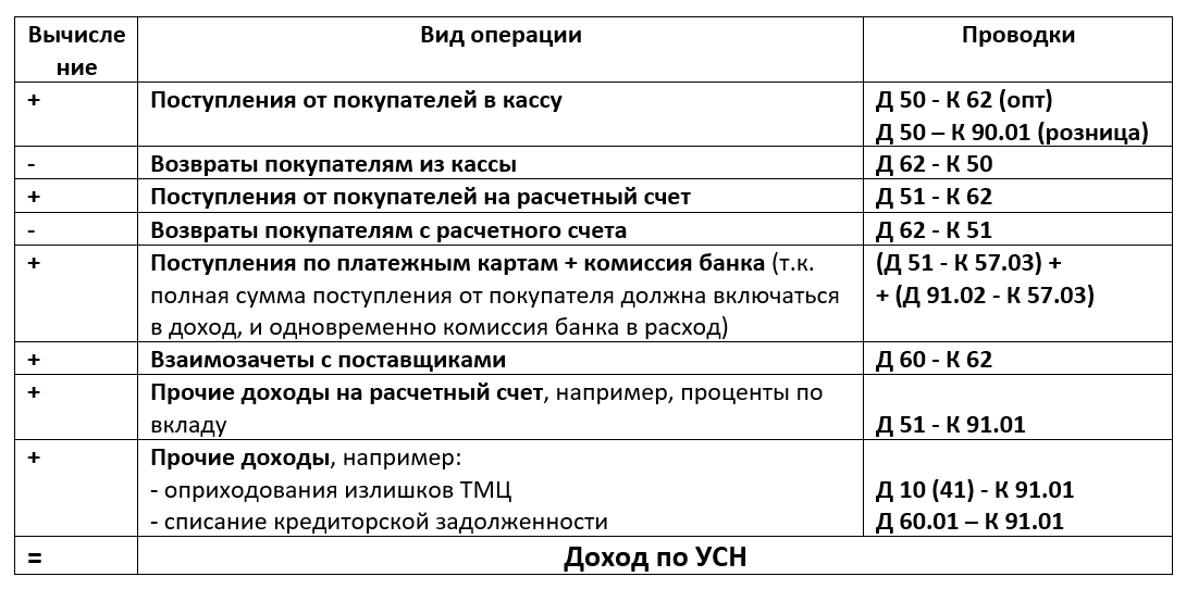 Как мы помним, доход в целях расчета налога по УСН рассчитывается кассовым методом, то есть складывается из фактического поступления денежных средств от покупателей, взаимозачетов и прочих доходов.