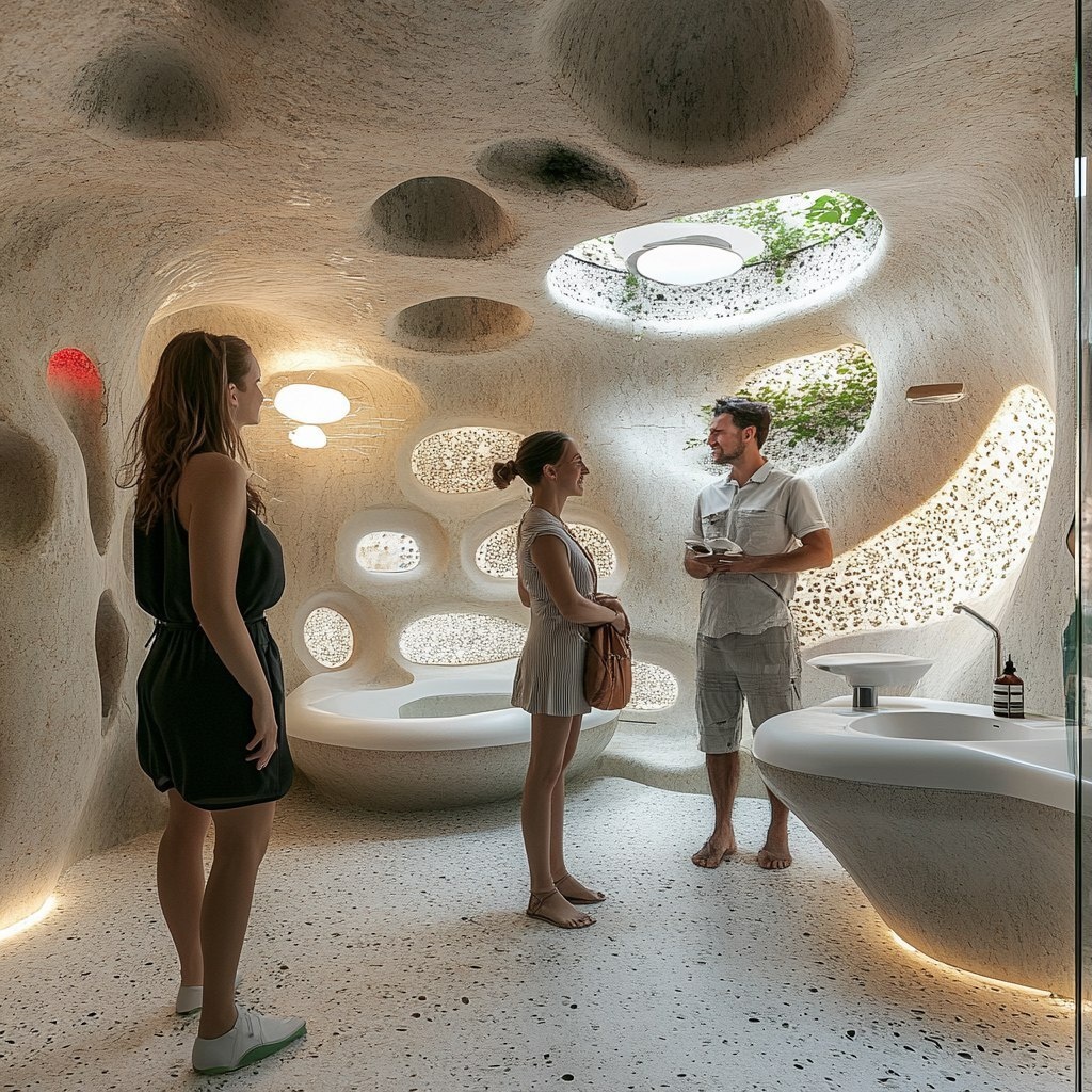 Создано на основе запроса: a realestate agent showing a couple through a futuristic bathroom by architectural biomimicry made of mushroom