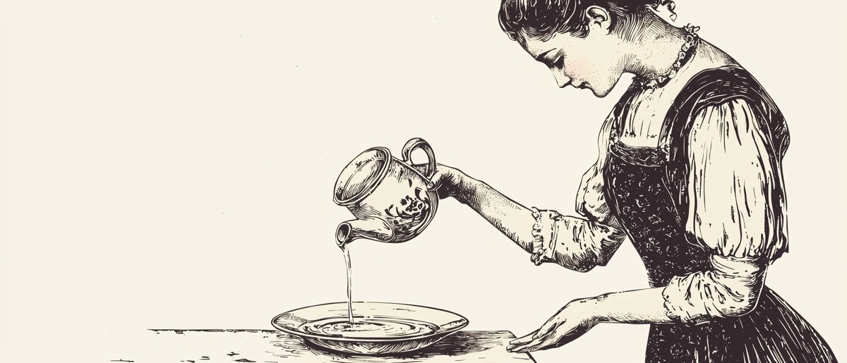 Создано на основе запроса: woman pouring a cup of water over a plate, line art, wood block printing, victorian illustration, vintage illustration, white background