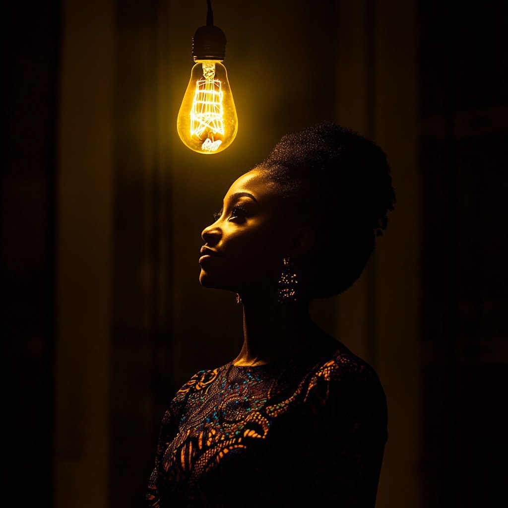 Создано на основе запроса: High-Quality Scene Composition: A Nigerian woman stands tall, her silhouette gracefully defined against the glow of a single, light bulb igniting hanging down above her. The background is intentionally minimal and dark