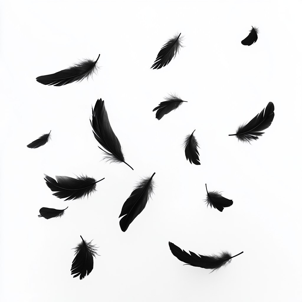 Создано на основе запроса: scattered black feathers falling through the air on a solid white background with high contrast there is space