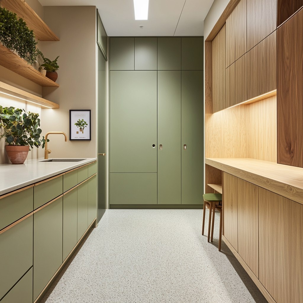 Создано на основе запроса: medical centre with soft green cabinetry, and blonde timber cabinetry with soft mottled light grey floors