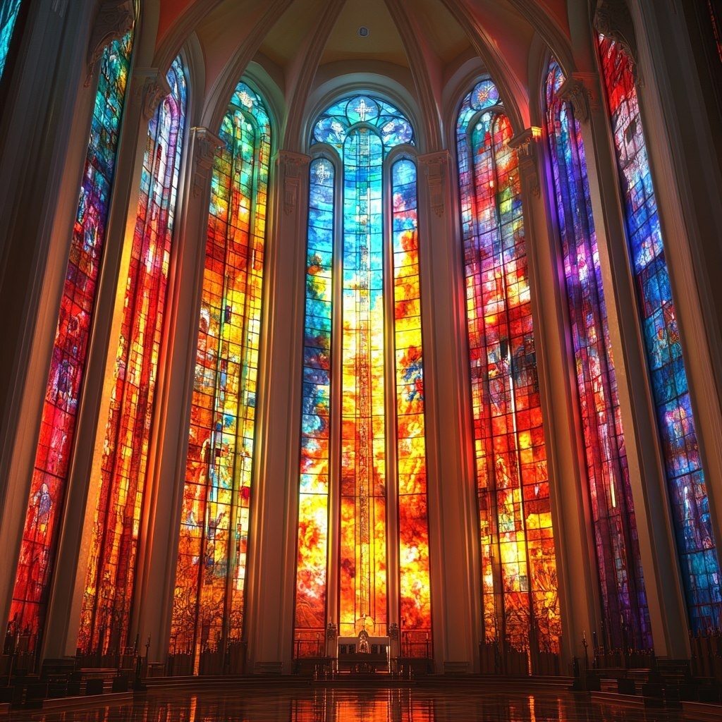 Создано на основе запроса: The spire of the church reaches straight into the sky, and the colorful glass windows shine brightly in the