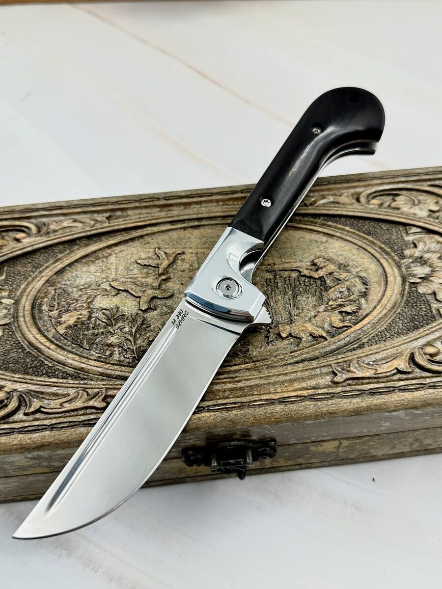 Готов складной нож «Пчак» из нержавеющей стали М390. Лучший нож для полевой и обычной кухни. Сталь по резу может сравниться с булатом, прочная на излом и гибкая. Накладки на ноже выполнены из черного граба. Нож заточен в бритву. Твердость клинка (HRC): 62 Цена ножа: 24.180 рублей, со скидкой: 19.344 рубля. В комплекте идут ножны из натуральной кожи. Можем сделать формованные ножны +8000 рублей. Для заказа писать на @Nazarklinokbot или по тел +79101343831 WhatsApp/Viber