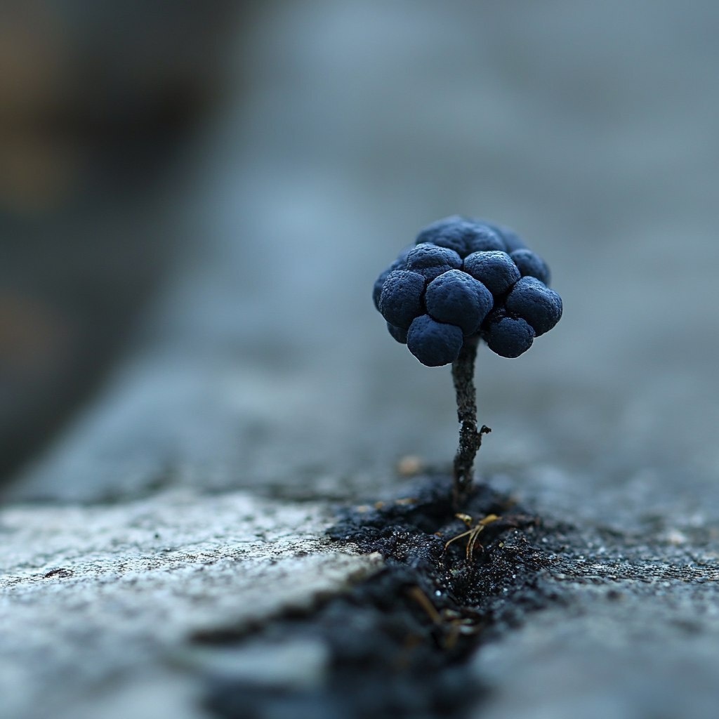 Создано на основе запроса: detailed photo, a dark blue bulbous fungal growth growing between the cracks in the cement, sidewalk, out of focus background
