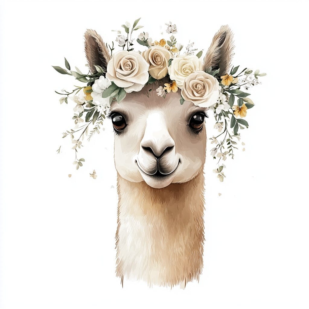 Создано на основе запроса: A graceful female alpaca in watercolor style, with soft beige wool and large gentle eyes. Wearing a delicate floral crown made of cream roses, white flowers, and soft greenery. White background, calm, elegant, and dreamy look