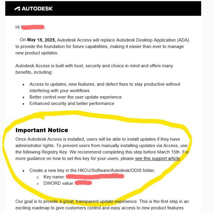⚡️Пользователи продуктов Autodesk, ранее преобретавшие ПО в официальном магазине, начали получать уведомления о возобновлении работы лицензий. В письме сообщается, что предполагаемая дата старта возобновления - 15 мая, прилагается установщик, инструкция и индивидуальный ключ на 1 год. Пока остаётся под вопросм: - каких именно продуктов это коснётся - на базе каких тарифов будет продление - как Autodesk будут решать вопрос с лицами перешедшими на так называемое "альтернативное" лицензирование
