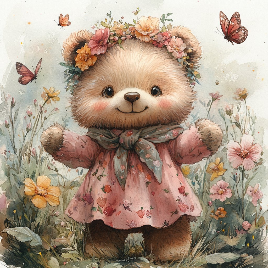 Создано на основе запроса: A full-body pink teddy bear girl standing in a blooming spring garden, surrounded by pastel flowers. She wears a floral pink dress and a flower crown, smiling gently with her arms open. Butterflies fly nearby, and the full teddy bear is clearly visible and centered. Soft watercolor background with flowers and greenery, square format (1:1), pastel tones, white space around the subject, matching the teddy bear from previous images.