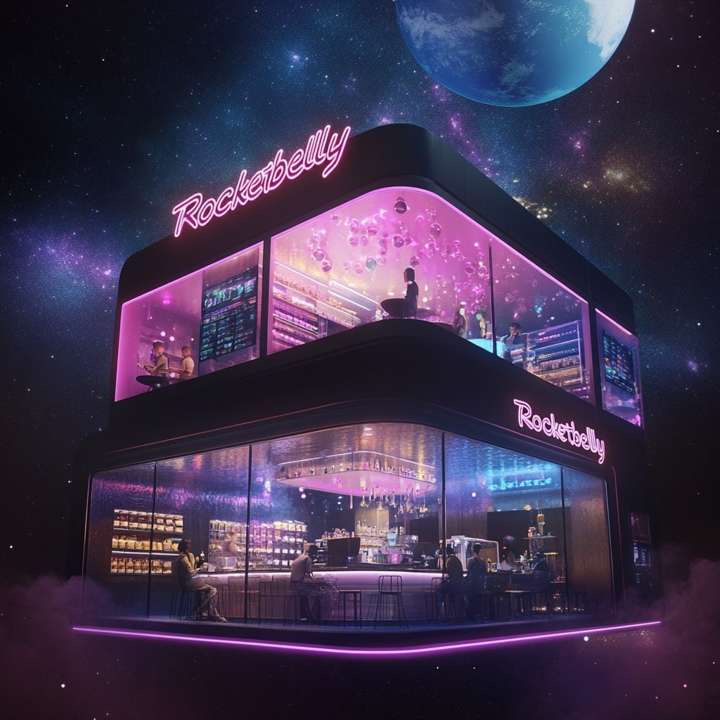 Создано на основе запроса: Exterior view of a floating futuristic restaurant and bubble tea bar with outside glowing signage, inside menu screens and accent lights of pink, cyan, blue, and purple floating in lower orbit like the space station. Front is glass and you can see inside where there is a bar with floating drink dispensers and people eating/drinking on floating tables. The name "Rocketbelly" in glowing lights outside. Background is of space and stars and earth.