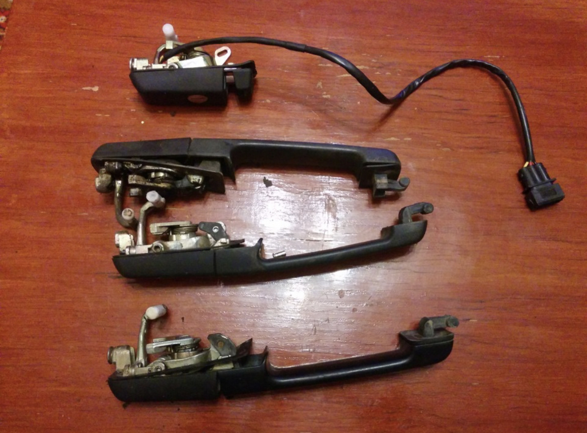 У меня имелось 4 ручки 3 из которых левые. Осмотрев их я понял что металлическая база цела только на китайской, ее и решил использовать. И так, берем старую ручку и снимаем с нее рукоятку (подвижную часть). Для этого нужно высверлить или просто выбить развальцованный клин. Далее снимаем с ручки резиновую прокладку, осторожно чтоб не порвать и не измять ее. Дальше тяните за ручку а сами помогаете пальцем и фиксируете все в таком положении. Вытаскиваем ручку поворачивая и вытаскивая с металлического крепления. Когда ручка снята берем донора и снимаем с обеих ручек стопорное кольцо (поддев отверткой) и механизм открывания с пружинкой. Вставляем ключь в личинку и вытаскиваем ее, далее переставляем нужную личинку на нужную базу. После того как вы поставили личинку на место ставим механизм открывания и стопорное колечко. Далее переходим к пластмассовой насадке.Выдавливаем клин и снимаем ее. Отрезаем кусок резины и вставляем внутрь так что бы при надевании клин струдом зашел на место и всег
