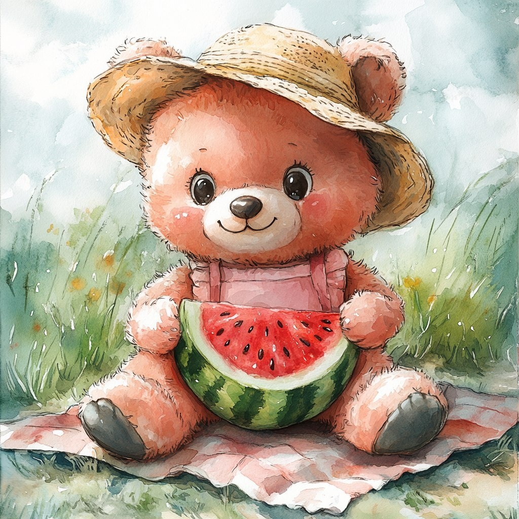 Создано на основе запроса: A cute pink teddy bear girl sitting on a picnic blanket, holding a slice of watermelon and smiling joyfully. She wears a sunhat and a sleeveless pink dress. The scene includes a sunny pastel background with watercolor grass, soft clouds, and white space around. Square format (1:1), child-friendly watercolor clipart style, matching previous teddy bear images.