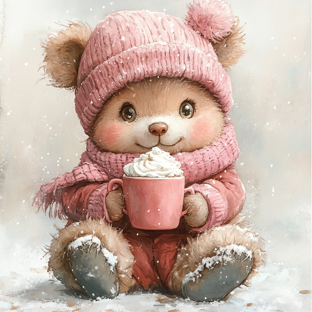 Создано на основе запроса: A full-body pink teddy bear girl sitting and holding a cup of hot chocolate with whipped cream. She wears a pink knitted winter hat with a pom-pom and a cozy scarf. The bear is fully visible, centered in the square. Soft watercolor snowflakes fall gently around. Square format (1:1), soft pastel watercolor style, child-friendly, white space around, matching the teddy bear style from previous illustrations. --- Автоперевод: Девушка с розовым мишкой для всего тела сидит и держит чашку горячего шоколада с взбитыми сливками. Круто выглядит? 🤔 https://dzen.ru/id/65c0c65c86e4f837c27b24d7 #ИИ #AI #нейросеть #midjourney #art