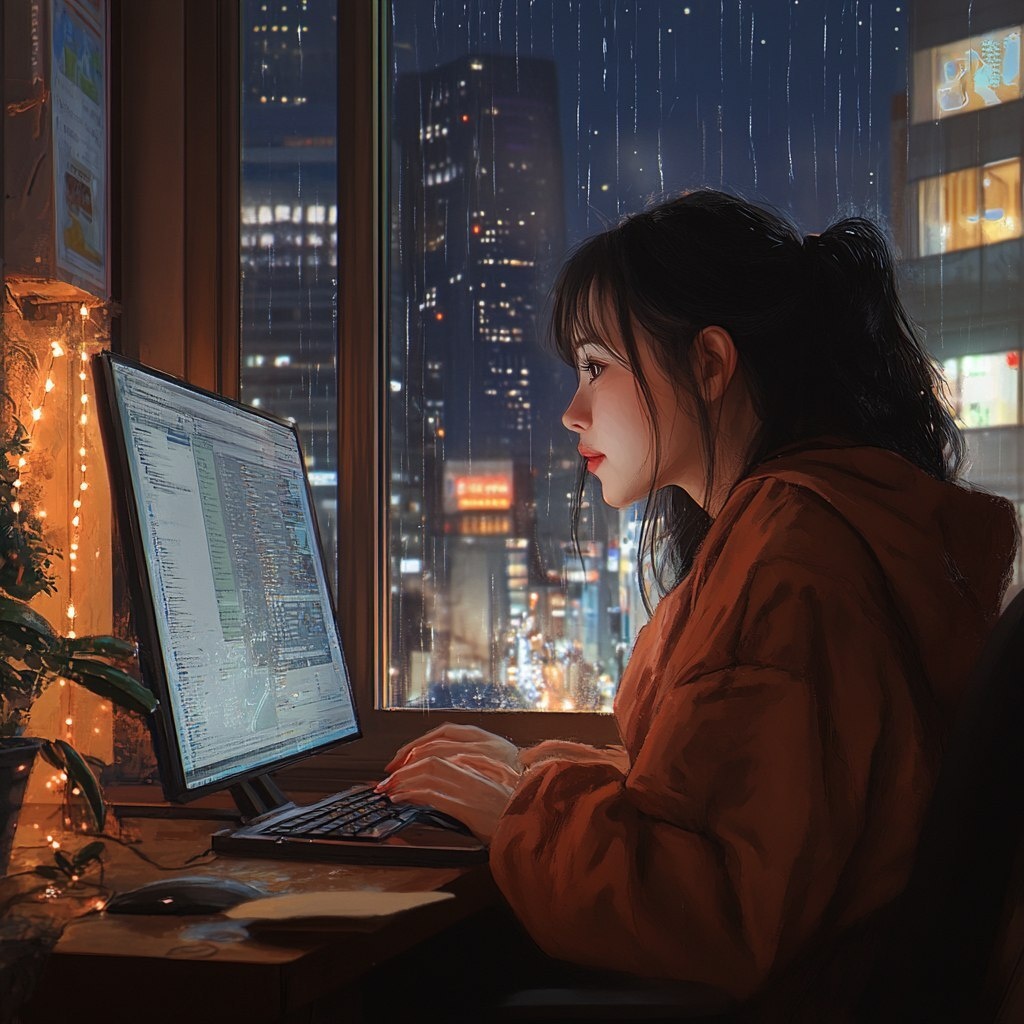 Создано на основе запроса: Beautiful Japanese woman in her 20s, working on a computer at a window seat, night city outside the window, horizontal screen size