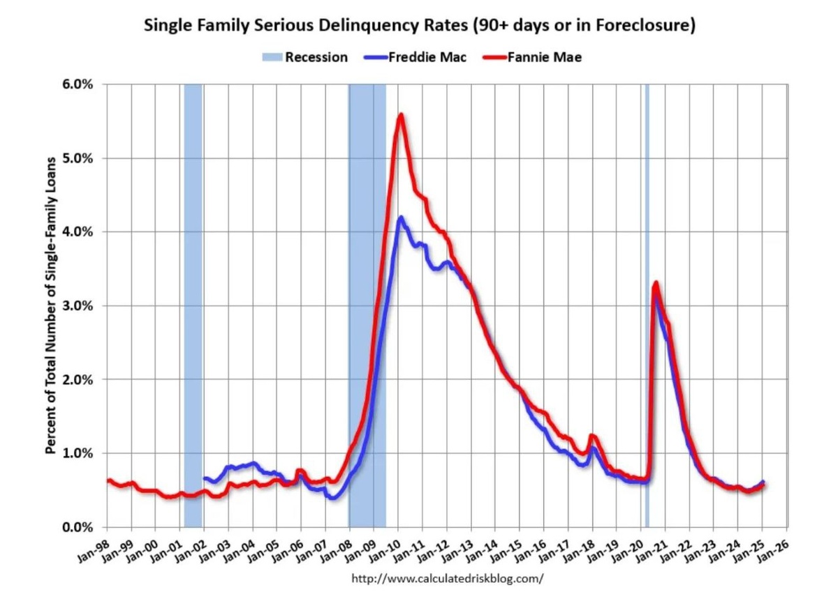 Fannie Mae сообщила, что уровень серьезных просрочек по односемейным ипотечным кредитам в январе составил 0,57%, что выше показателя в 0,56% в декабре. Уровень серьезной просрочки вырос в годовом исчислении с 0,54% в январе 2024 года, однако это ниже допандемического минимума в 0,65%. Уровень серьезной просрочки Fannie Mae достиг пика в феврале 2010 года на уровне 5,59% после пузыря на рынке жилья и достиг пика в 3,32% в августе 2020 года во время пандемии. Это ипотечные кредиты, которые «просрочены на три ежемесячных платежа или более или находятся в состоянии конфискации». Ипотечные кредиты, находящиеся в состоянии просрочки, учитываются как просроченные в этом ежемесячном отчете, но не сообщаются в кредитные бюро.