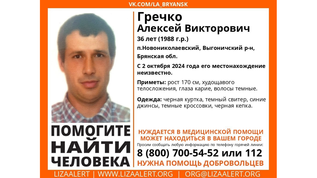 В Брянской области продолжаются поиски без вести пропавшего уроженца поселка Новониколаевский Выгоничского района Брянской области Алексея Гречко. Местонахождение 36-летнего мужчины, который нуждается в медицинской помощи, неизвестно со 2 октября 2024 года. Объявление о розыске пропавшего появилось в соцсетях в группе поискового отряда «Лиза Алерт». Приметы пропавшего: рост 170 сантиметров, худощавого телосложения, глаза карие, волосы темные. Был одет в черную куртку, темный свитер, синие джинсы, темные кроссовки. На голове – черная кепка. Всех брянцев, кто располагает сведениями о пропавшем, просят позвонить по телефонам 8-800-700-54-52 (горячая линия отряда «Лиза Алерт») или 02, 102 (полиция). В Брянской области ищут без вести пропавшего 36-летнего Алексея Гречко
