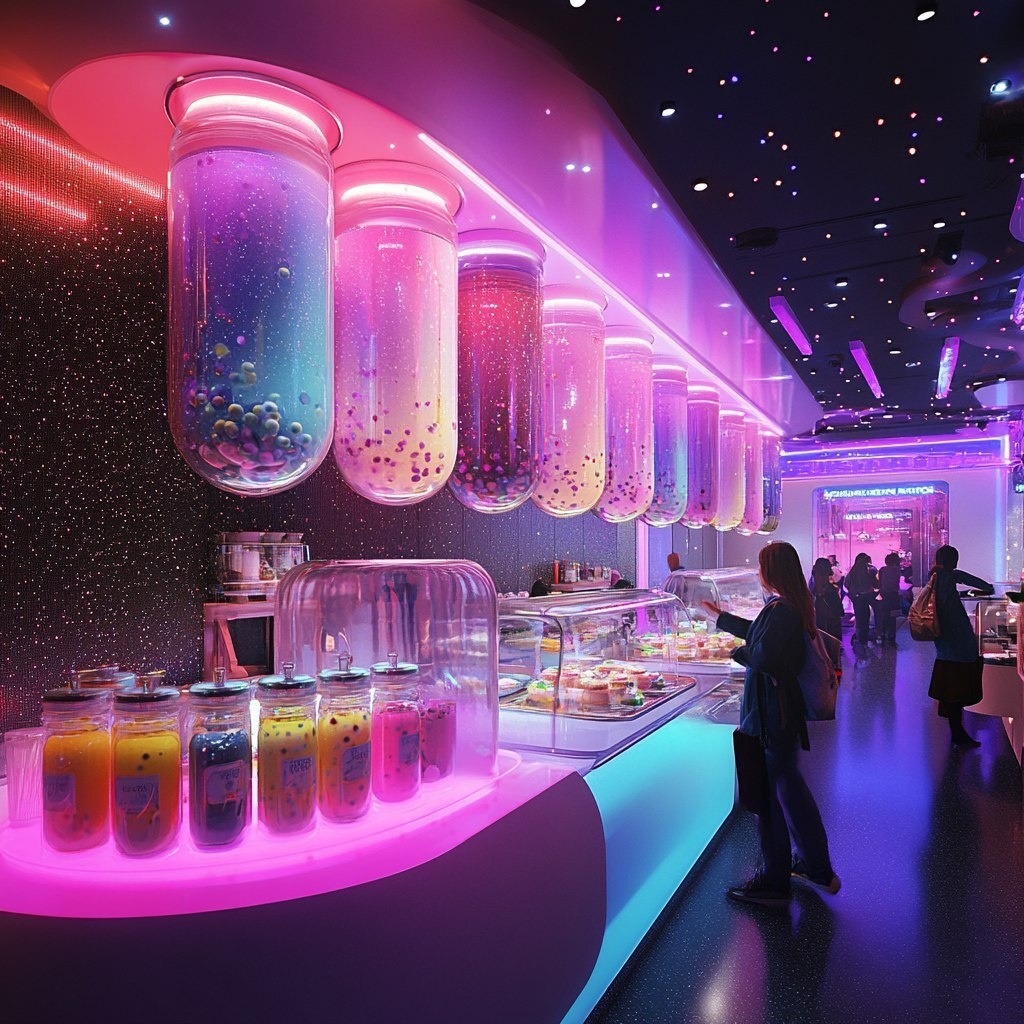 Создано на основе запроса: interior of a futuristic bubble tea shop and restaurant that floats in space