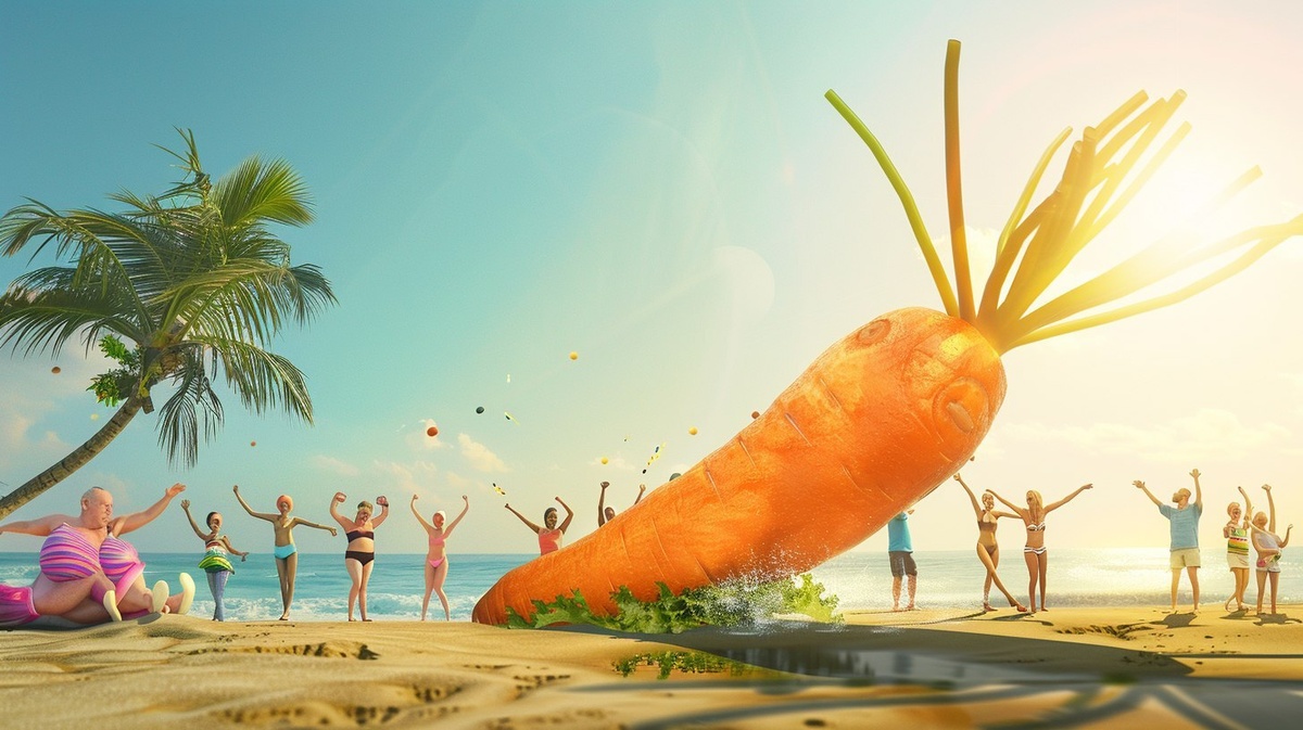 Создано на основе запроса: An imaginative large carrot, surrounded by happy people celebrating. A stunning setting with a clear, bright blue sky. The surface is bathed in warm sunlight, casting soft shadows, with a slight reflection to enhance the premium feel. The background features tropical palm trees, a sunlit ocean, and a relaxing vacation ambiance. No objects or text on the surface. Ultra-realistic, high-resolution, cinematic lighting, 8K, professional photography style --- Автоперевод: Воображаемая большая морковь, окруженная счастливыми людьми, празднующими. Отлично вышло? 🤔 https://dzen.ru/id/65c0c65c86e4f837c27b24d7 #ИИ #AI #нейросеть #midjourney #art