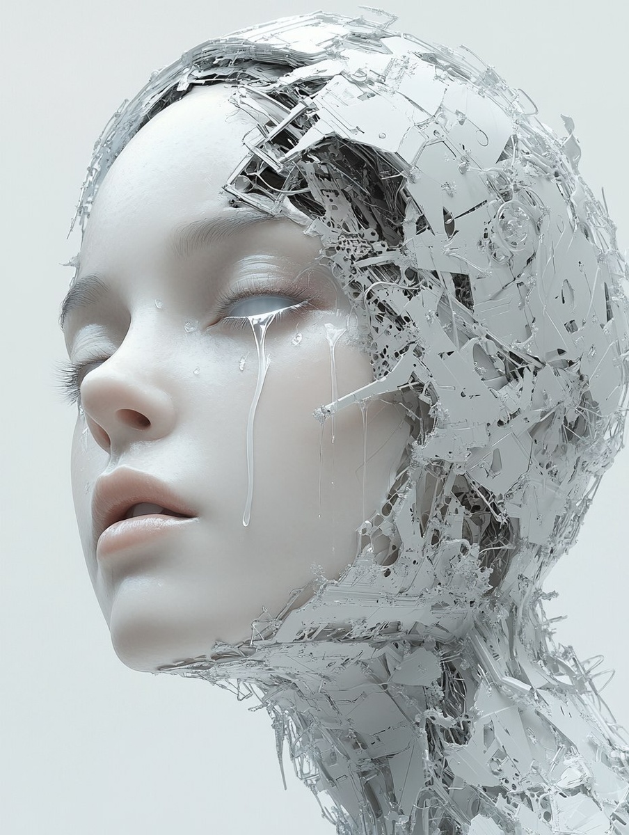 Создано на основе запроса: A surrealist illustration depicts the silver goddess' Lade ', with tears on her face and a veil made up of technological symbols on her head. The color scheme is slightly white, with a melancholic style, a fusion of human and machine, and a bionic figure. The light source is backlight.