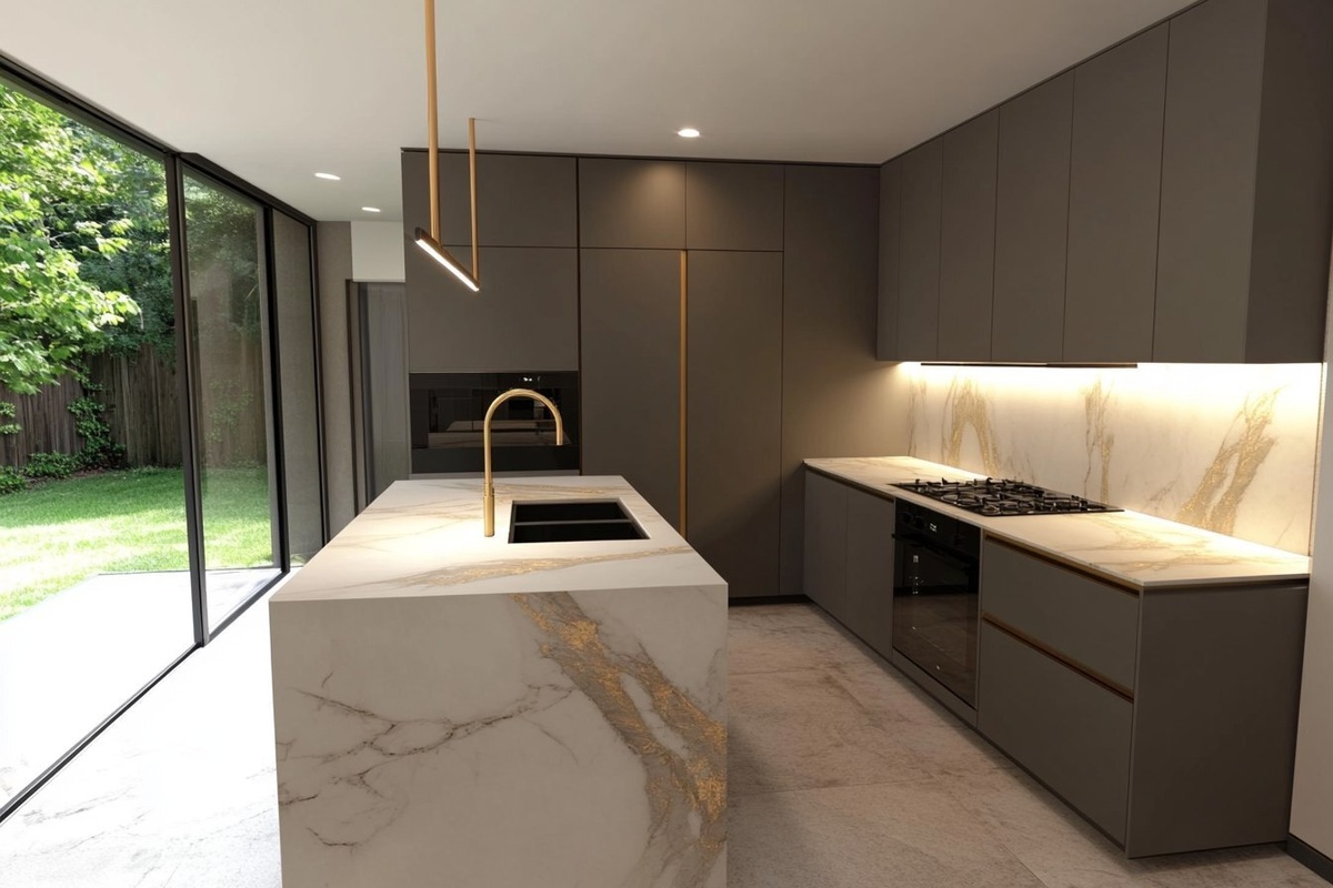 Создано на основе запроса: small kitchen, warm grey matte cabinetry, sleek handless Scandi design, there's a small window and counter