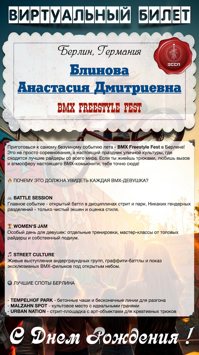 🎉🎂 Поздравляем с Днём Рождения Анастасию Дмитриевну Блинову! 🎂🎉 Дорогая Анастасия Дмитриевна! Сегодня — ваш особенный день, и мы от всей души хотим сказать вам самые тёплые, искренние и добрые слова. 💫 Вы — неиссякаемый источник крутых идей, творческой энергии и позитива, и гениальность твоих задумок восхищает всех вокруг! ✨ Вы — человек, который умеет превращать мечты в реальность! ✨ Ваш креатив, смелость и умение видеть необычное в обычном делают мир интереснее. Вы не просто мыслите вне рамок, а создаёте эти рамки заново! И пусть все ваши проекты будут такими же 🔥, как и Вы! 🎨 В этот особенный день желаем вам: - Мега-вдохновения — пусть новые идеи прилетают, как мемы в ленте! 🚀 - Крутых возможностей — чтобы все ваши задумки взлетали, как вирусные тренды! 💡 - Крепкого драйва — энергии на сто тысяч процентов! ⚡ - Лёгкости и кайфа — чтобы даже рутина становилась приключением! 🌈 - И, конечно, море классных моментов — пусть каждый день будет как лучший сторис! 📸 💖