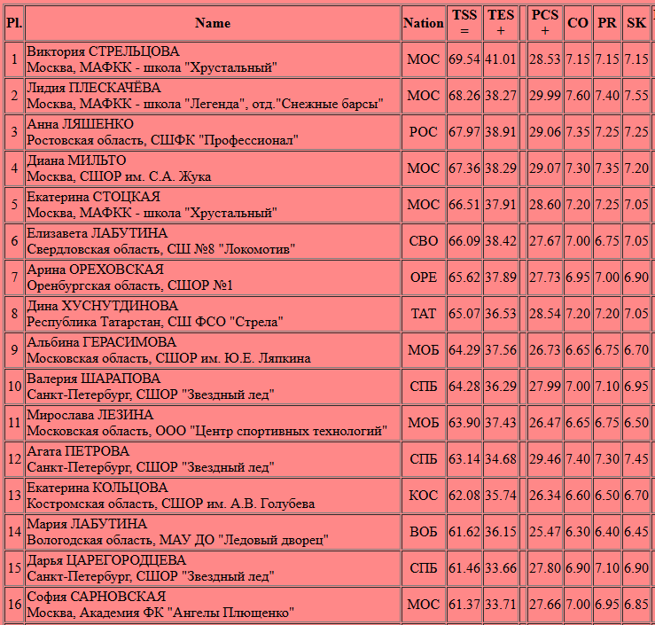 Понравилась лично мне программа Даши Царегородцевой (61.46 - 15 место) под музыку из олимпийской КП Ани Щербаковой, но судьи оценили ребро Даши на лутце, как неверное, что отняло от каскада сразу 3 балла. Привычно уверенный по прыжкам получился прокат у Кати Кольцовой (62.08 - 13 место), а более высокие баллы ей помешали набрать непрыжковые элементы, исполнение которых объективно не является сильной стороной фигуристки из Костромы. Совсем не получился сегодня тройной флип у Агаты Петровой (63.14 - 12 место). Очень редкая для нее ошибка. Остальные технические элементы исполнены уверенно, лидеры остаются в прямой видимости, но до пьедестала почета дотянуться уже вряд ли получится, а другой большой цели у Агаты нет, ведь в сборную России она уже прошла.