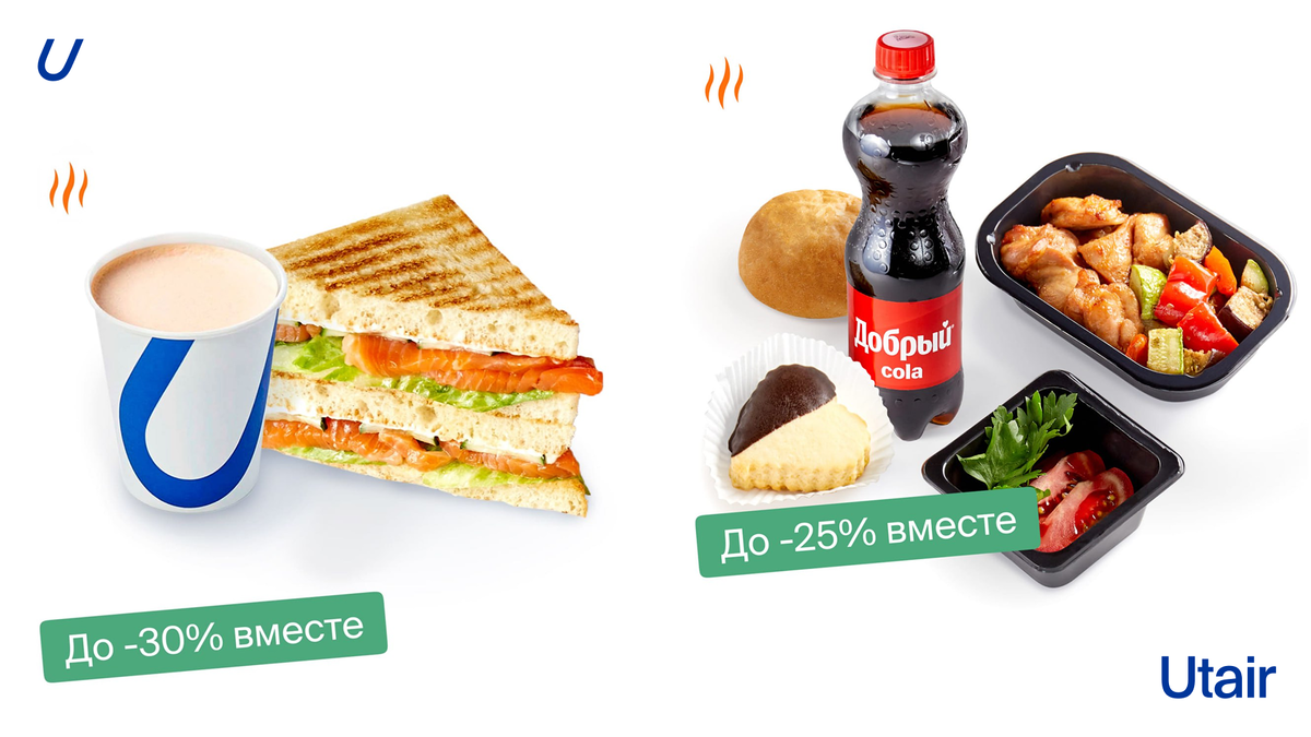 Экономьте до 30% при заказе питания в полет — выбирайте наши комбо-наборы для легких перекусов, полноценных завтраков, обедов и ужинов! В ассортименте любимые десертные блюда 🔘 Блинчики со сметаной и творогом и микс-салат из свежих фруктов 🔘 Ароматный кофе со сливками и молочный шоколад 🔘 Бодрящий горячий чай и шоколад Сытный перекус 🔘 Сэндвич с лососем на тостовом хлебе и кофе со сливками Блюда от шеф-повара 🔘 Курочка по-кавказски и кола 🔘 Стейк из форели с овощами гриль и чай ➡️ Заказать питание можно на всех этапах планирования путешествия: при покупке билета и регистрации на рейс, а также в любое время в разделе «Управлять билетом» на utair.ru и в мобильном приложении «Уютное небо».