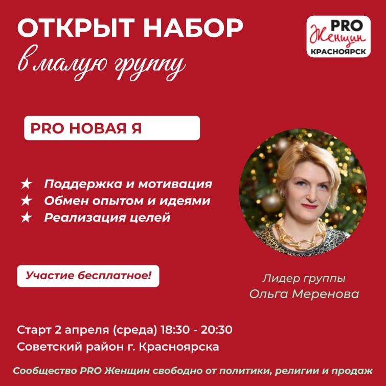 🔔 ОТКРЫТ НАБОР В ГРУППУ "PRO НОВАЯ Я" Участие безоплатное! ❤️ Лидер Сообщества PRO Женщин, Ольга Меренова, объявляет набор в группу поддержки для женщин, стремящихся раскрыть свой потенциал и уверенно двигаться к своим целям 😚 Слово Ольге: «В нашей группе мы будем мотивировать и делиться опытом друг с другом на пути к счастливой жизни 😘 На наших встречах вы сможете: ◽️ Определить свои цели, приоритеты и ценности ◽️ Получить мощный заряд мотивации и вдохновения! ◽️ Обрести поддержку в кругу единомышленниц Вместе мы – сила! Эта группа для тех, кто: ◽️ Чувствует, что живет не своей жизнью ◽️ Хочет изменить что-то, но не знает, с чего начать ◽️ Ищет поддержку и вдохновение от других женщин ◽️ Готов действовать и создавать свою новую реальность ✔ Старт 2 апреля 18:30-20:30 ✔ Встречи будут по средам ✔ Еженедельно, всего 8 встреч ✔ Советский район г.Красноярска 🗺 Регистрация в группу по ссылке: https://pro-women.org/groups/119988/» По вопросам пишите лидеру группы Ольге Мереновой в