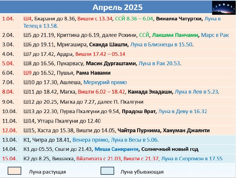 И вашему вниманию календарь на Апрель. Немного пояснений: • Красным помечены неблагоприятные элементы Панчанга, которых стоит избегать для важных дел и начинаний созидательного характера, а также для финансовых дел. • Зеленым указаны Сарвартха Сиддхи Йоги ССЙ, хорошее сочетания Накшатры и вары, которые дают дополнительные бонусы дню. • Синим – переходы Луны и других планет в знаки. • Жирным – праздники и враты. Про праздники и враты: • Винаяка Чатуртхи и Санкашти Чатуртхи – это дни почитания Ганеши. • Прадош врат, Калаштами и Шиваратри – это дни Шивы. • Экадаши – дни поста, посвященного Вишну. • Дургаштами – день Дурги. • Сканда Шашти – день Сканды/Картикеи. • В этом месяце два особых дня, связанных с процветанием и благоприятных для начинаний. Это Лакшми Панчами 2 апреля и Акшая Трития 30 апреля. Учитывая транзиты остальных планет, и особенно Венеры, в Лакшми Панчами будет благоприятна скорее Лакшми пуджа, нежели начинания. А в Акшая Тритию, как уже много раз говорилось, благоприятн