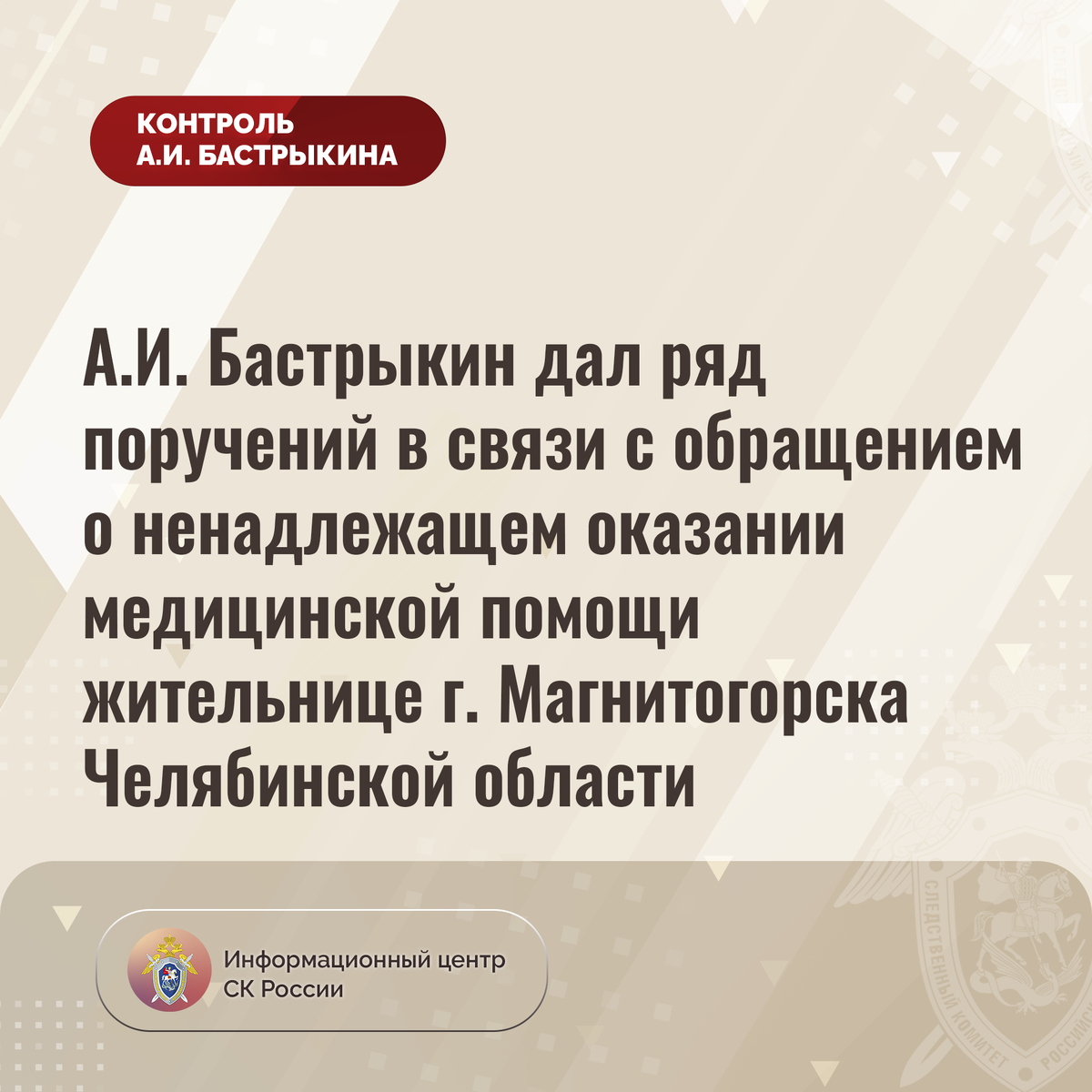 А.И. Бастрыкин дал ряд поручений в связи с обращением о ненадлежащем оказании медицинской помощи жительнице г. Магнитогорска Челябинской области В комментариях в аккаунте Информационного центра СК России «ВКонтакте» размещено обращение по вопросу несогласия с ходом установления обстоятельств ненадлежащего оказания медицинской помощи жительнице города Магнитогорска Челябинской области. В июле 2023 года из-за проблем со зрением женщина обратилась в одну из частных клиник, где ей сделали операцию. Однако спустя некоторое время самочувствие пациентки ухудшилось, в результате чего зрительный орган утратил свою функцию. Пострадавшая лишилась работы и возможности управлять автомобилем. Расследование уголовного дела приняло затяжной характер. Ранее указанная ситуация освещалась в СМИ. А.И. Бастрыкин поручал представить по ней доклад. В СУ СК России по Челябинской области по данному факту расследуется уголовное дело. В ФГКУ «Судебно-экспертный центр Следственного комитета Российской Федерации»